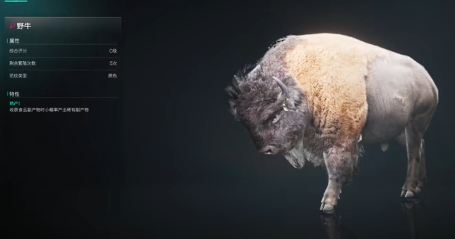 野牛在游戏中有多种重要作用,野牛分为河谷属性和群山属性,不同属性的野牛牛皮有着不同的功效,河谷属性的野牛牛皮制作的装备,能让玩家在受到暴击伤害时恢复15%的生命值,而群山属性的野牛牛皮制成的装备,则可提供15%的暴击伤害减伤效果,此外野牛还可以进行繁殖养殖,由于野牛分公母,玩家将其捕捉后可以带回基地饲养,通过繁殖持续获取牛皮,同时野牛还能为玩家提供食物和材料,它可以产出大块肉和皮革,这些都是游戏中非常宝贵的资源。
