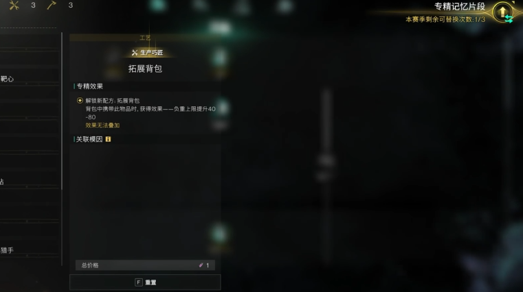 还有其他可考虑的专精,拓展背包能提升玩家负重上限,使玩家在探索时可携带更多物资返回基地,契合喜欢探索与采集的玩家需求,木石行囊能减轻背包中矿石、碎石、原木的重量,同样利于资源收集与运输,特制储物箱可制作64格储物空间的箱子,大幅增加玩家物资存储容量。