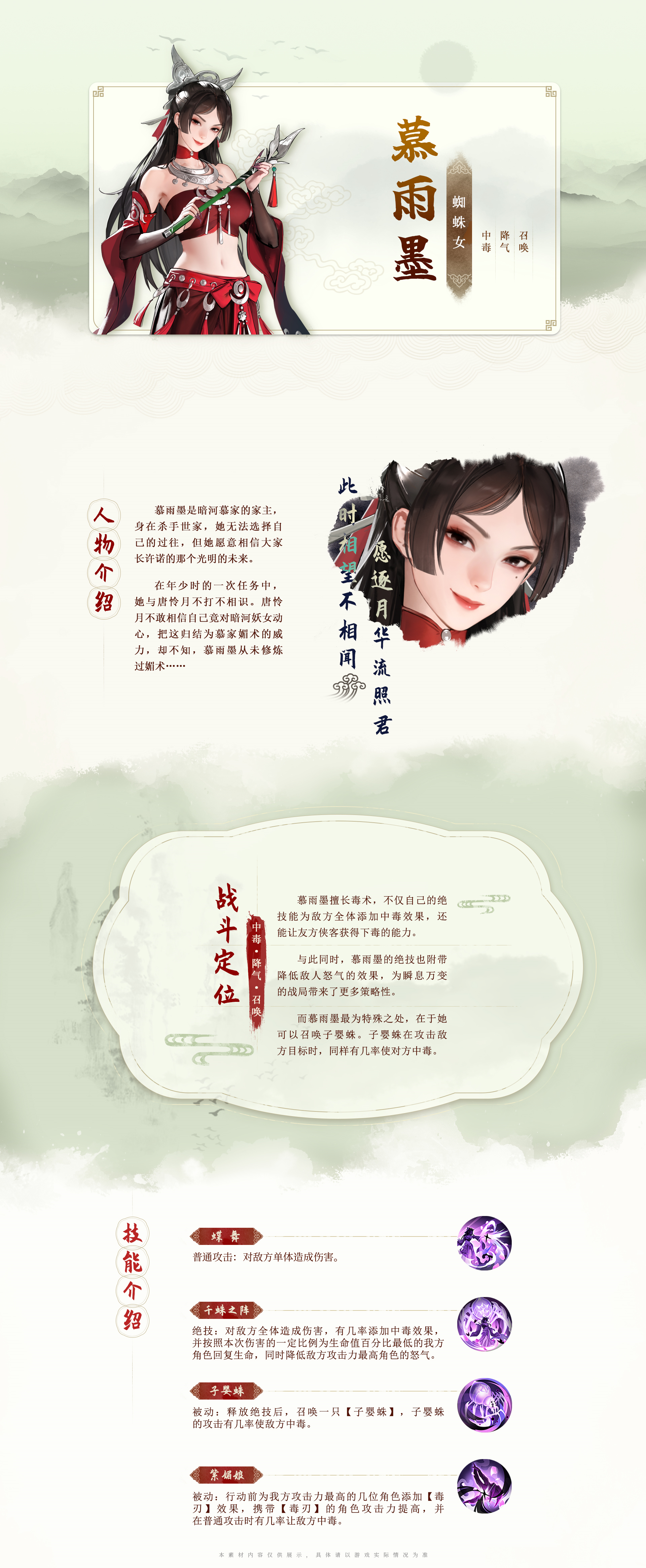 而慕雨墨最为特殊之处,在于她可以召唤子婴蛛。子婴蛛在攻击敌方目标时,同样有几率使对方中毒。