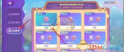 2、在这个页面,点击左侧的礼包助手,找到免费招募礼包进行购买;