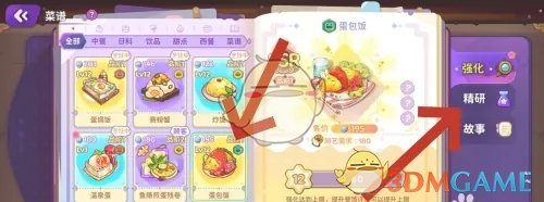 答:前往菜谱页面,点击精研,选择菜谱完成精研即可