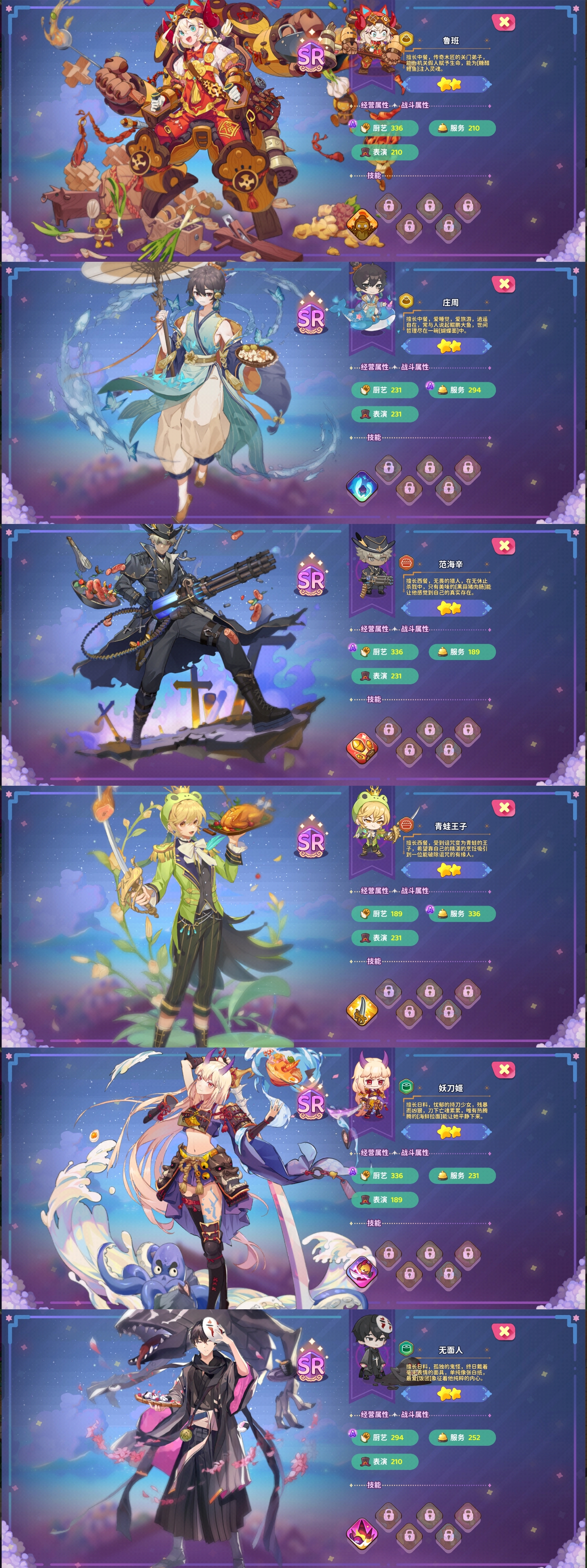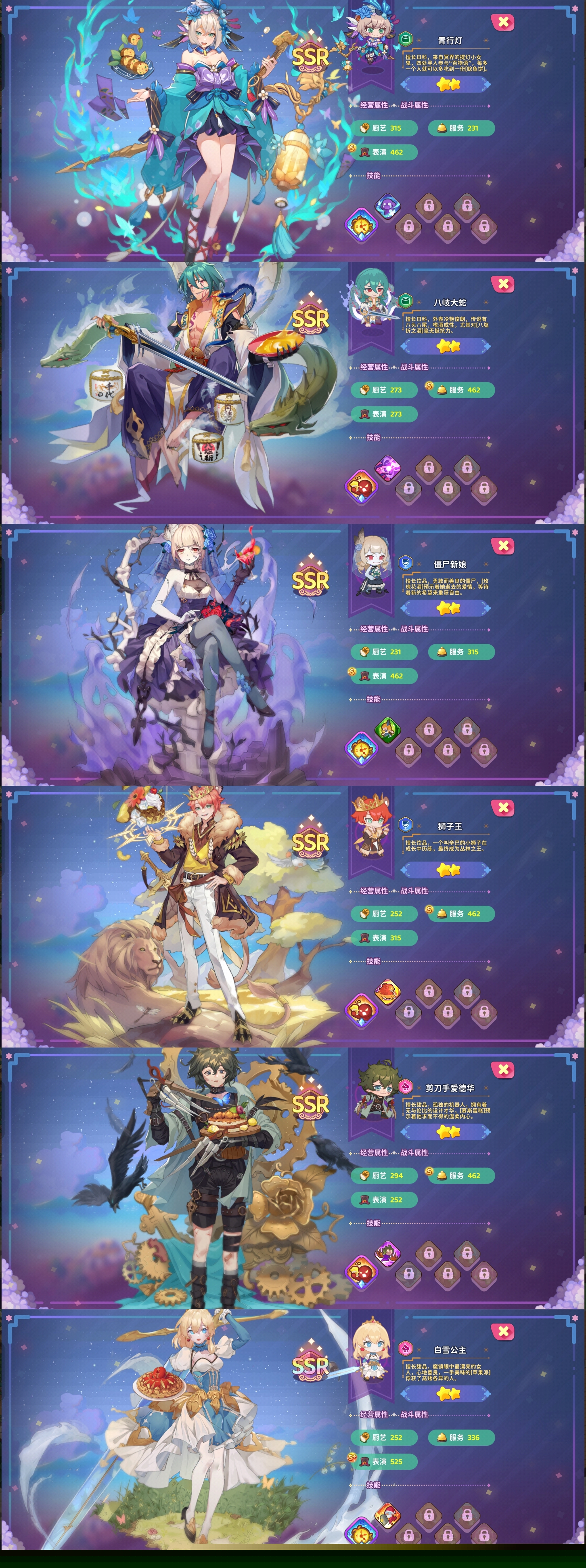 角色按类别可以分为中餐、西餐、日料、饮品、甜品五类(图片按类别分的),同类别员工有经营属性加成。