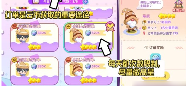 梦境食旅云币是非常重要的资源,可以购买家居来提高繁荣度。云币获取的方式也比较少,基本上是通过经营餐馆和订单收入,但是想获取大量云币主要还是靠的订单,订单每日上限是只能做六次,用道具或者钻石可以解锁额外次数,订单也分星级,星级越高的获得的奖励也是越丰厚的,还有月卡也可以加三次订单,如果有条件的也可以开一下月卡,还是比较划算的。