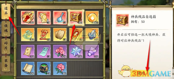 4、即可使用神兵残品自选箱来获取对应的残品道具了;