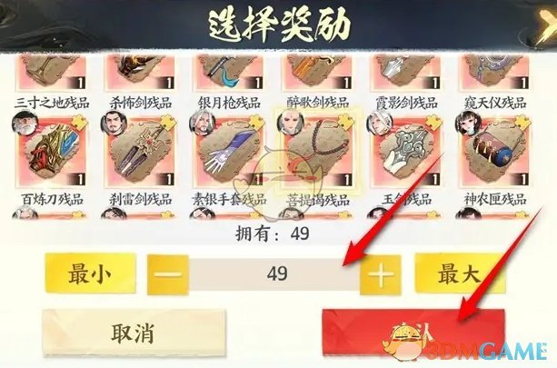 3、在选择奖励页面,勾选想要的残品点击确认;