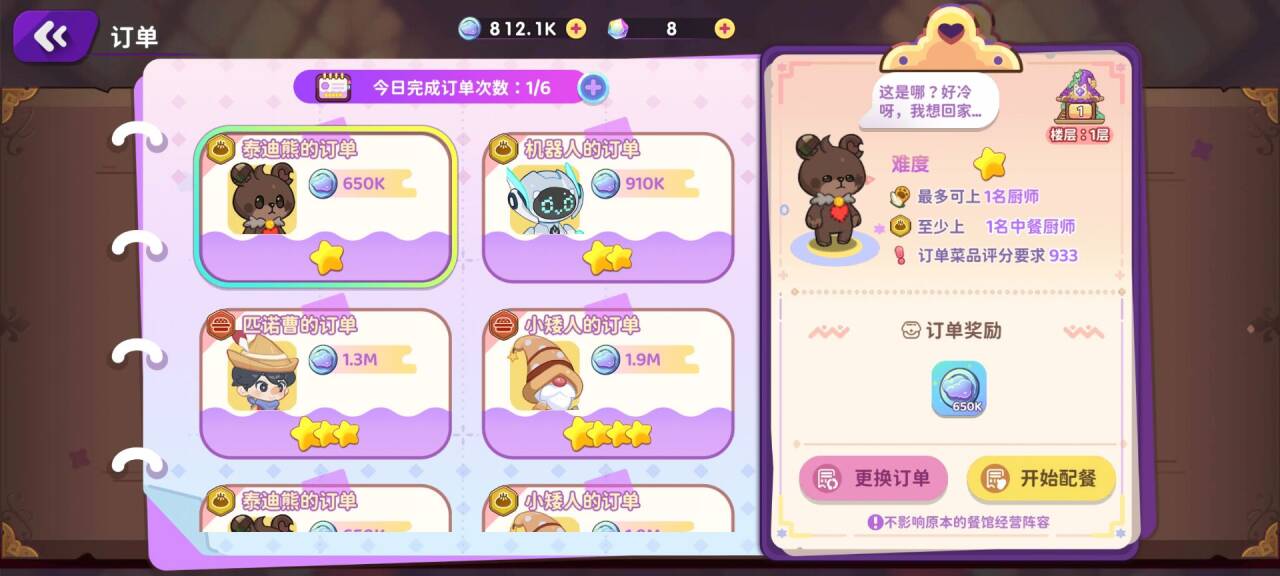 解锁订单系统后,可以先不做。如果没有云币的时候,可以来做一些星少的(前期星高的条件不符合的多)。1-3星给的云币够给做装饰的。每个订单的条件都不同,要求:菜品评分,配置条件等。