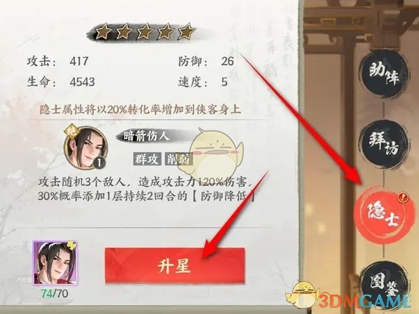 答:找到隐士后,点击升星,即可对隐士进行升星。