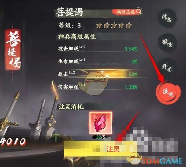 3、然后点击右侧的注灵,点击注灵按钮即可完成神兵的注灵;