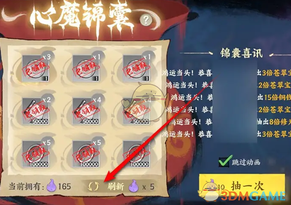 4、最后刷新完成,就可以在心魔锦囊内使用心火积分抽取新的奖励了;