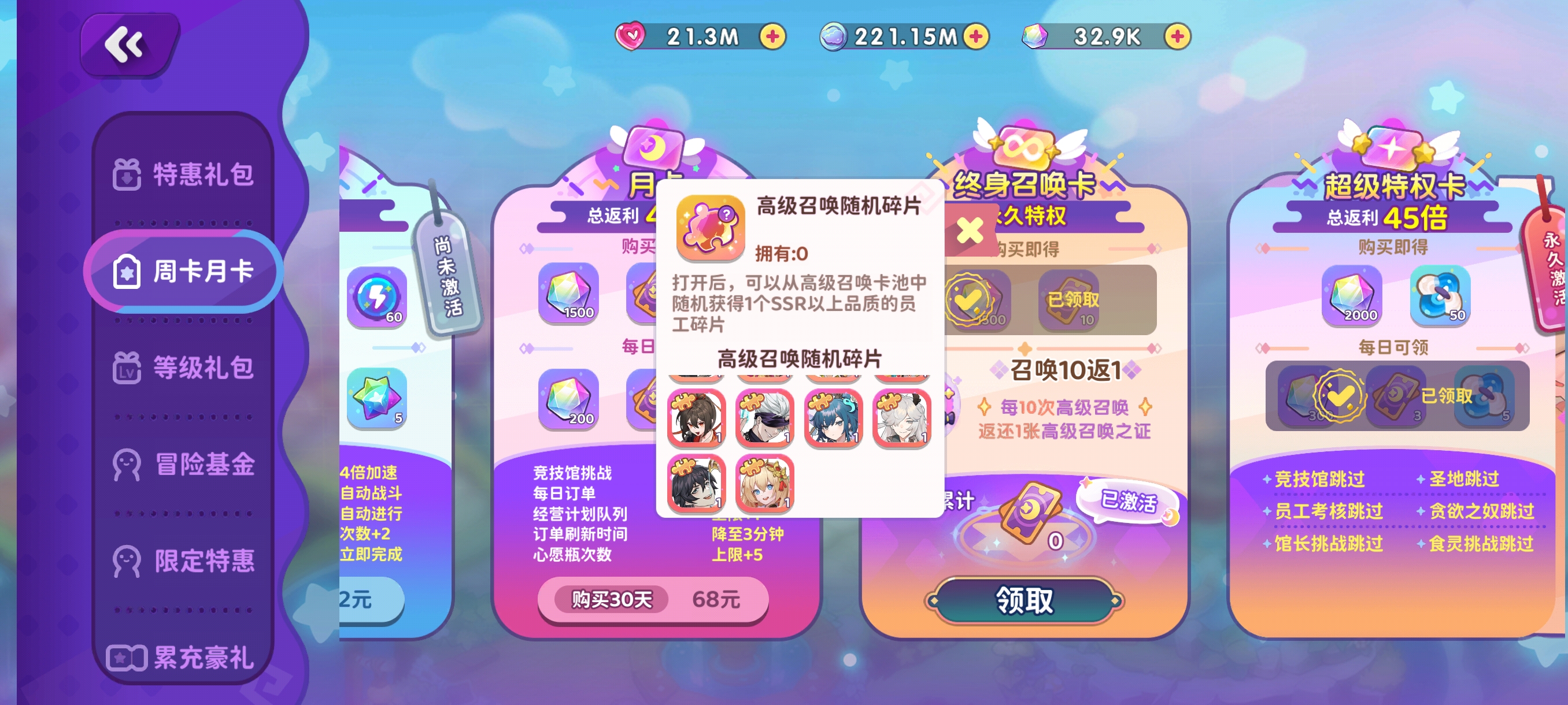 后两图为氪金大佬氪金向礼包,这两个礼包可以攒着等以后ur进入你的高级召唤池再使用效果更好,后两个碎片与40片ssr碎片同理。