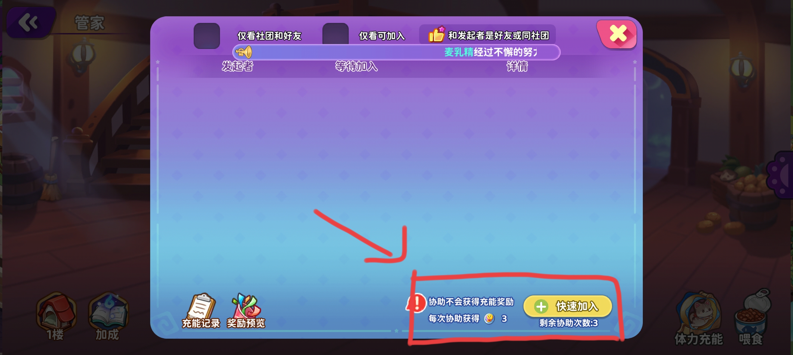 2.管家充能可以选择仅加入好友或社团,这样可以多拿一个罐头;3次充能结束还可以助力三次,一次给三个友情币