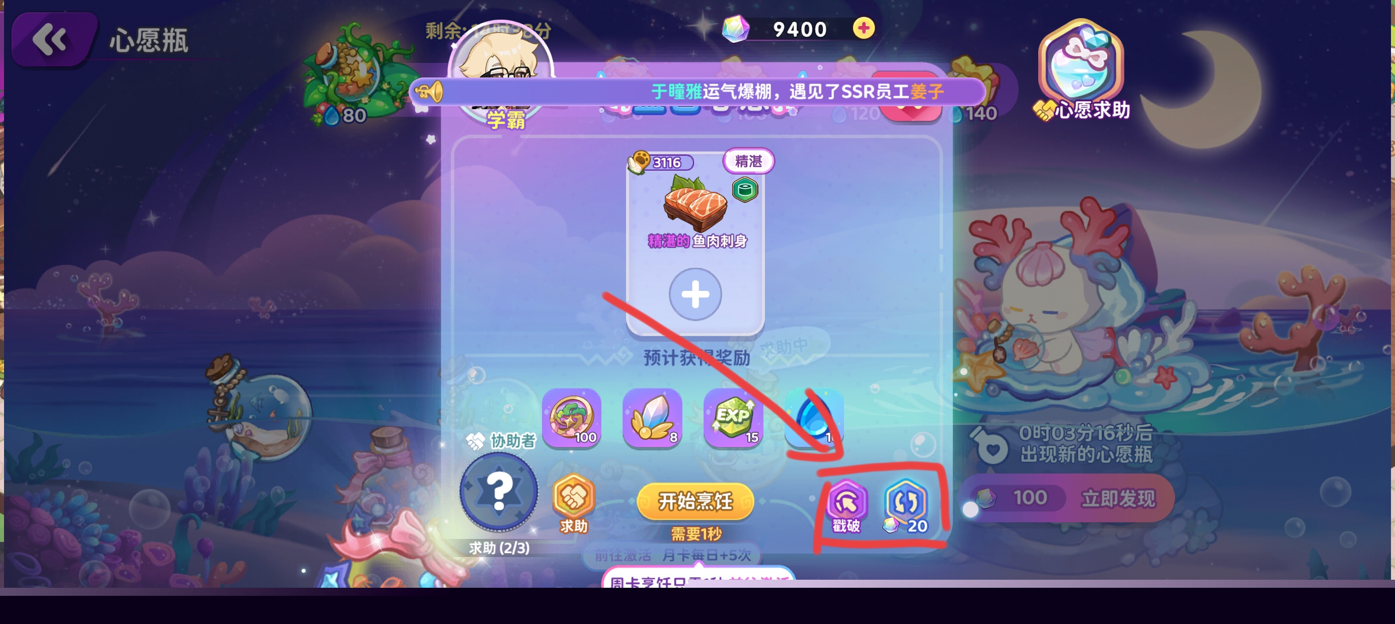 5.社团的心愿瓶有蓝,紫,金三种品质,蓝色100社团币,紫色150,金色200(金色的瓶子上带粉蝴蝶结),如果想多拿一点社团币可以刷金色的做,每天3次免费刷新,戳破要等5分钟(没氪月卡)
