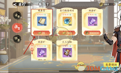 1、首先我们进入游戏内杂货商行,然后点击晚来雪道具进行购买;