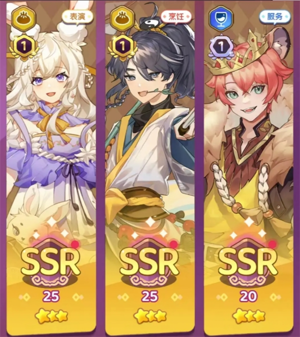 而这70抽里除了第一个必出的SSR姜子牙外,应该还会出一个SSR,我这里是出了服务型的狮子王,这样姜子牙(厨艺),嫦娥(表演),狮子王(服务)三种属性的SSR就都凑齐了,可以快速推员工考核了