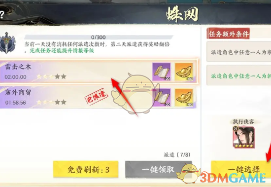 2、进入到蛛网界面选择一个派遣任务,点击下方的一键选择,执行侠客点击派遣。