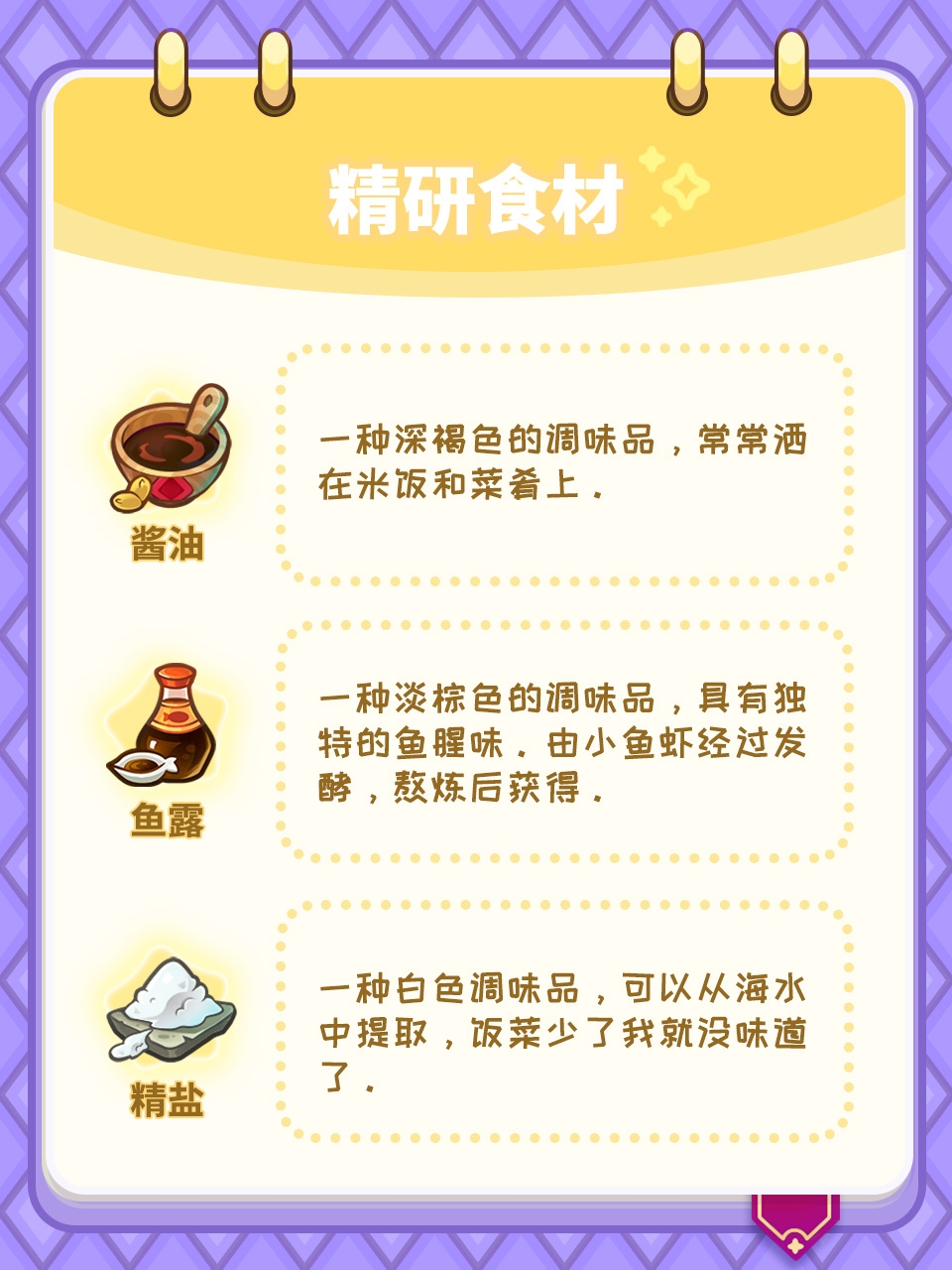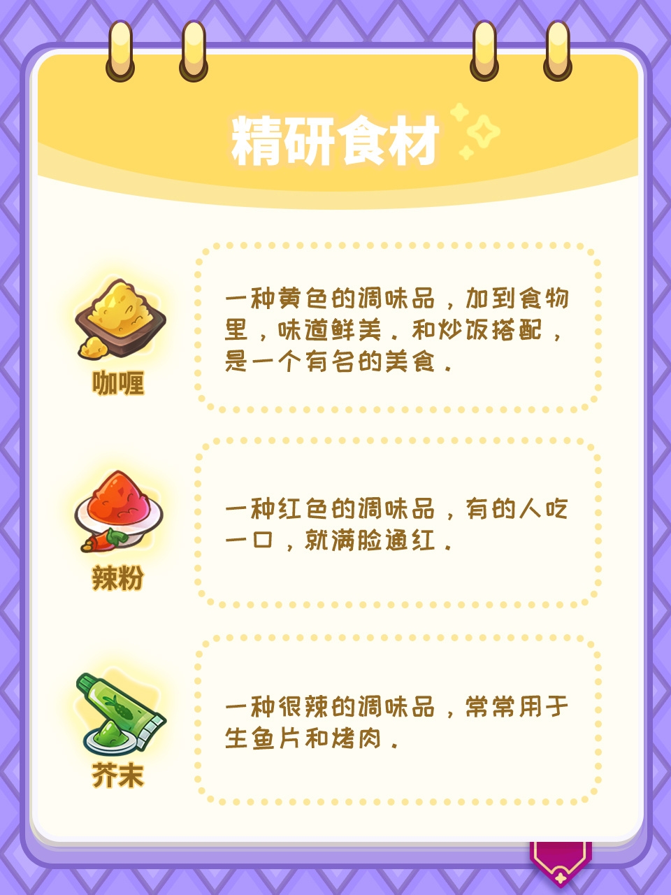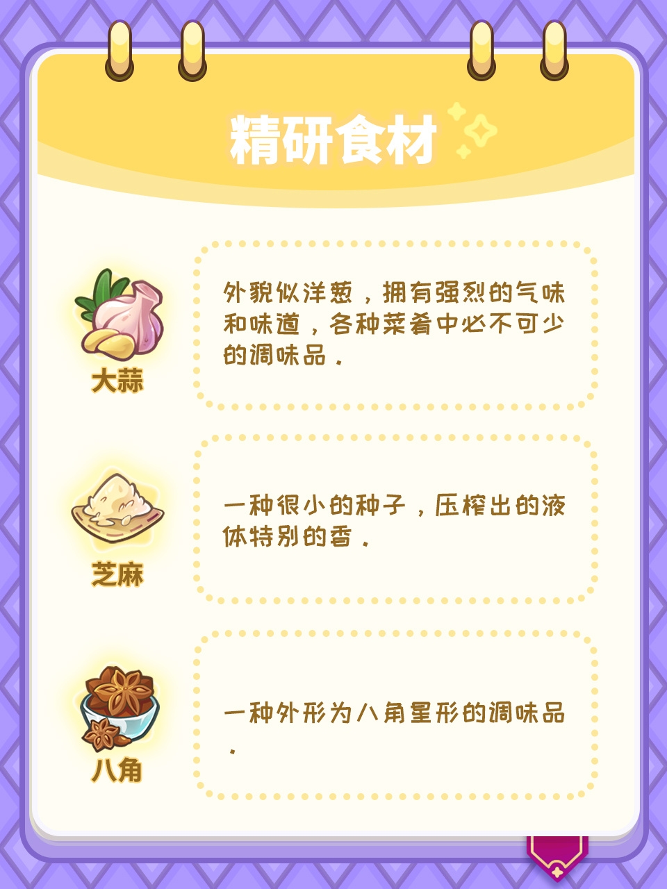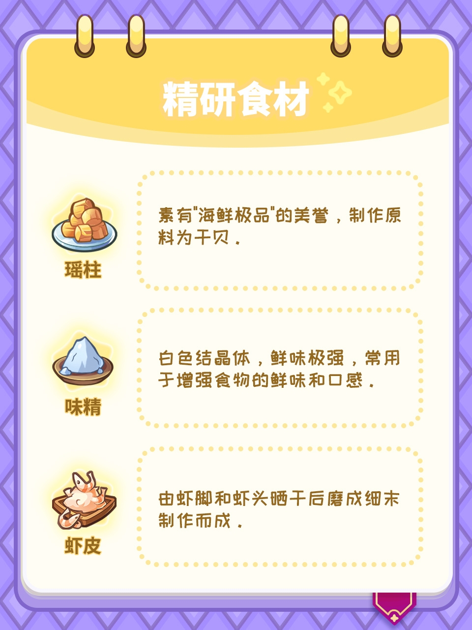 谜题对应的精研食材如下: