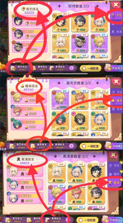小tips:可观察最下一排对手信息与自身厨艺技法、服务技法、表演技法能力相比对,两胜对手即可。