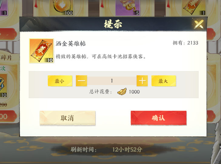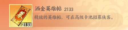 洒金英雄帖:精致的英雄帖,可在高级卡池招募侠客。
