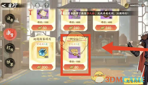 答:在商行页面,消耗80个元宝即可购买剑心令。