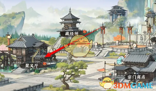 2、展开多个功能菜单后,点击宗门进入,在宗门界面点击聚义厅进入。