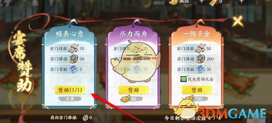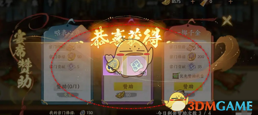 4、选择好之后点击下方的赞助即可完成,并领取获得宗门贡献等奖励。
