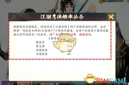 3、在问号界面即可查看到江湖名侠招募概率公示,晚来雪71%、登天酒20%、地境侠客7%、天境侠客2%。