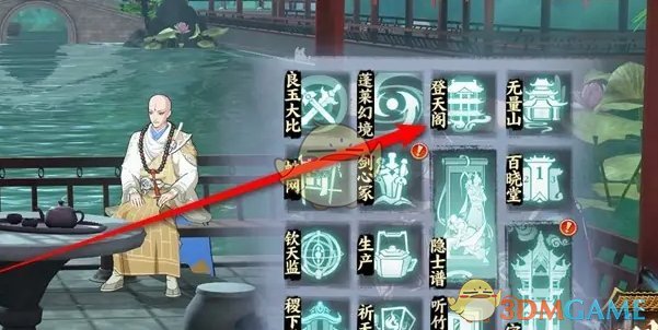 1、首先我们在游戏主页,点击箭头图标,在菜单栏中点击登天阁;