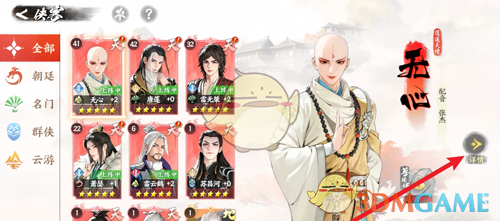 2、在侠客页面,选择需要查看的技能侠客,点击右侧的详情;
