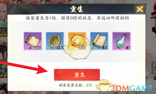 1、每位侠客可以免费重生2次,消耗免费次数后就要氪金重生;