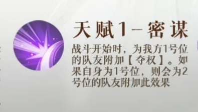 先说天赋"密谋"。战斗一开始,庞羲会自动给1号位的队友附上【夺权】。如果庞羲自己站在1号位,那就转移到2号位身上。这个天赋是被动触发的,不需要手动操作,但站位要提前想好。1号位一般建议放输出能力强的角色,这样开局第一时间就能进入有效状态。