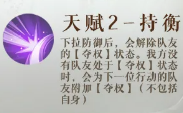 天赋"持衡"是维持【夺权】循环的关键。庞羲每次下拉防御之后,当前【夺权】状态的队友会被解除,但下一个行动的队友会重新获得【夺权】。这个循环不断转,只要庞羲保持行动,队伍里基本上一直都有人处于【夺权】状态,不会白白断掉。