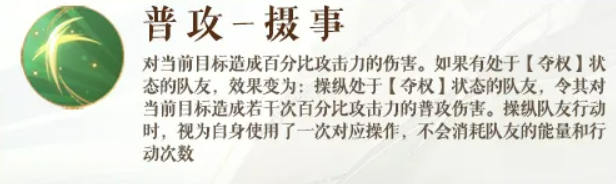 普攻"摄事",分两种情况。队伍里没有【夺权】队友的时候,庞羲自己出手打伤害。但如果有处于【夺权】状态的队友,庞羲就会操纵那个队友,让他对目标打出若干次普攻伤害。操纵的时候算庞羲自己用了一次普攻,不消耗被操纵队友的能量,也不占用他的行动次数。说白了,就是借别人的手打出额外一轮攻击,自己资源没动。
