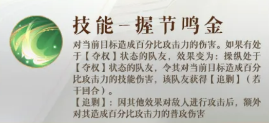 技能"握节鸣金"也是同样的逻辑。没有【夺权】队友就庞羲自己打,有的话就操纵队友打出技能伤害,而且被操纵的队友还会额外获得【追剿】状态,持续若干回合。【追剿】的效果是,队友每次因为其他效果对敌人出手之后,会追加一次普攻伤害。听着不起眼,但叠起来之后每轮都多一次输出,时间长了很可观。