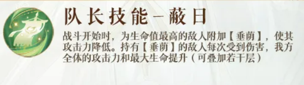 队长技能"蔽日"是开场就能感受到的效果。战斗开始时,血量最高的那个敌人会被附上【垂荫】,攻击力直接下降。而且,只要带【垂荫】的敌人受到伤害,我方全队的攻击力和最大生命就会往上涨,还能叠层。所以庞羲当队长的打法很明确,开局集中火力打那个被标记的敌人,边打边叠全队属性,越打越强。