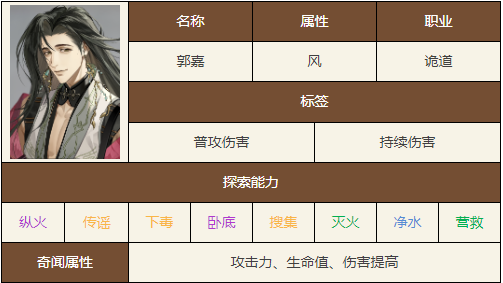 《如鸢》郭嘉是一位风属性的诡道角色,能够造成群体伤害,并使敌人获得易伤buff,非常适合群攻队伍,因此很多玩家都想知道如鸢郭嘉的技能是什么,下面小编就给玩家们带来了如鸢郭嘉的技能天赋介绍。