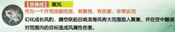 幻化成长风豹,腾空跃起召唤龙卷风将大范围敌人聚集,并在空中翻滚对范围内的目标造成风属性伤害。