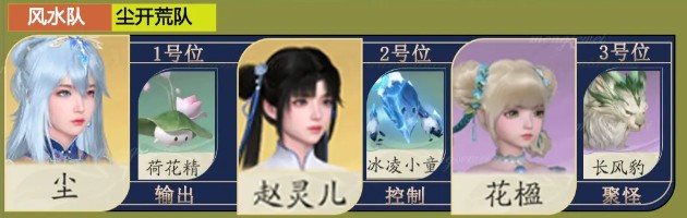 1、配队:尘+荷花精、赵灵儿+冰凌小童、花楹+长风豹。