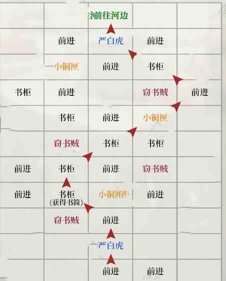 2、藏书阁:前进-严白虎-前进-书柜*3-小铜匣-前进-书柜