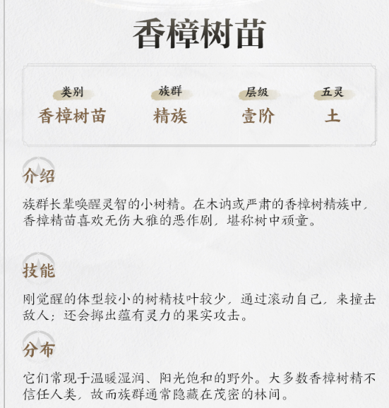 香樟树苗在此游戏中原本是香樟树的小树精,虽然刚开始的体型比较小,但是玩家千万不要小看这种精怪,却拥有着超强的战斗实力。具体的作用是由两个方面,分别是战斗以及探索。能帮助玩家在战斗当中,释放超强的战斗实力轻而易举将敌人打败。