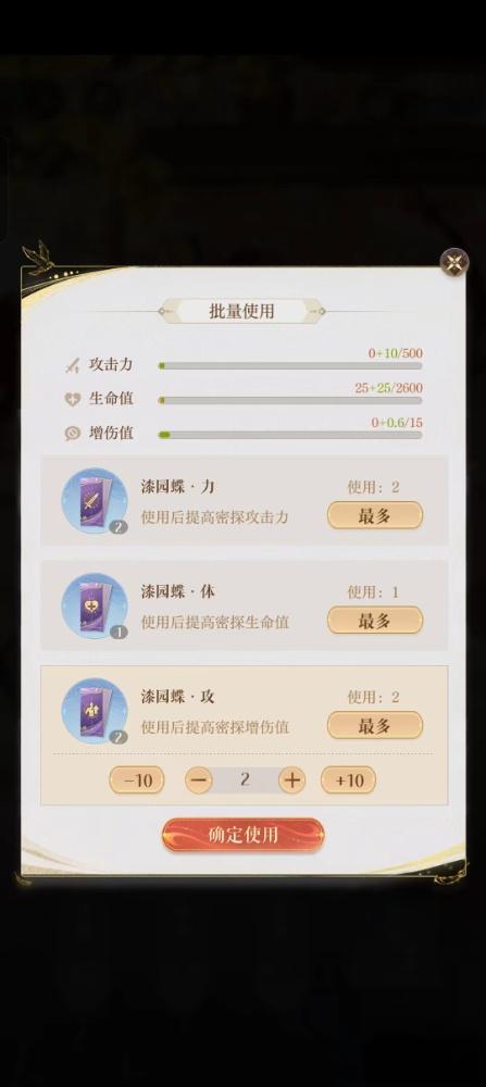 建议玩家优先培养的是攻击力和生命值。但是获取的漆园蝶类型不能选择,所以遇到不合适的也可以给其他密探使用。游戏中有近50位密探供玩家收集培养。看着自己养成的角色一天天变得厉害,一定非常有成就感。