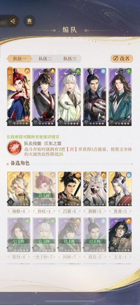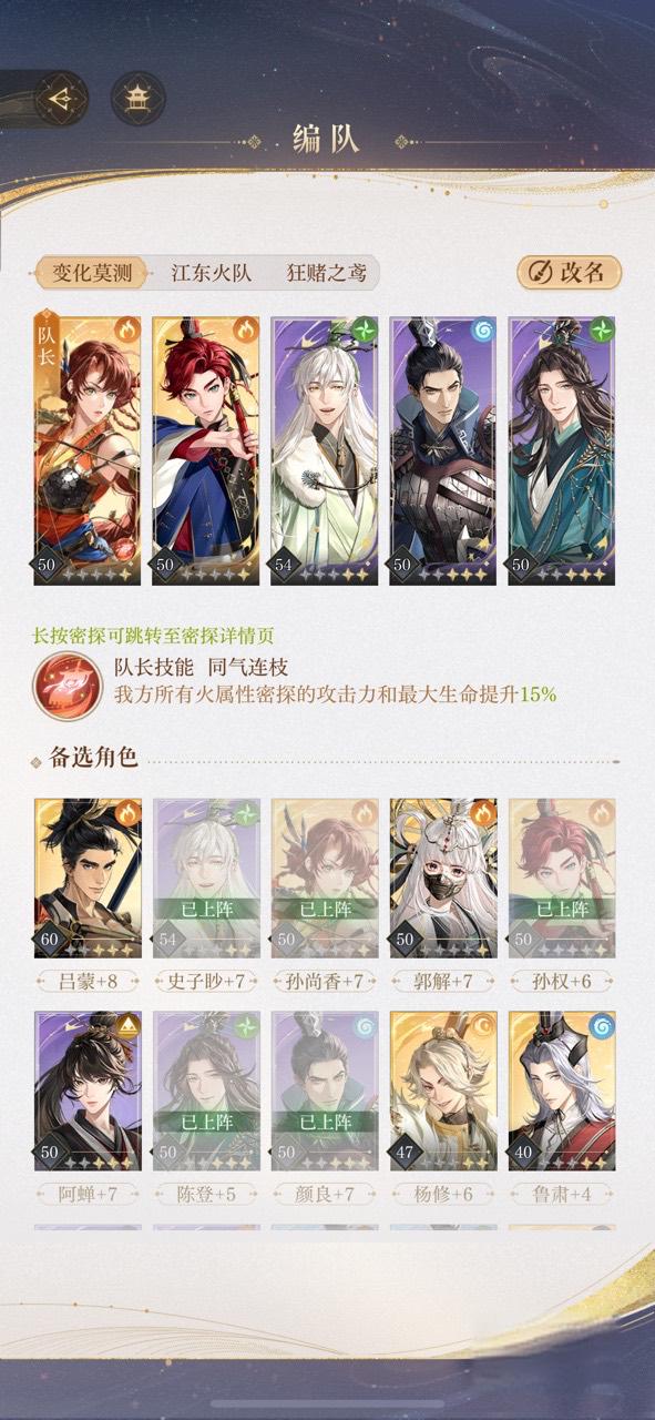 火队:郭解、孙权、孙尚香、吕蒙、陆逊。可以给全队火属性伤害升级。