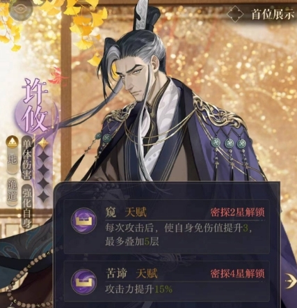 许攸在进行战斗的时候技能能够对敌人造成240%的攻击力伤害,如果敌人是在沉默的状态上伤害还会进行增加本身的攻击力伤害也是比较出色的。天赋技能是许攸的王牌,能够在进行多次攻击之后提升自己的免伤值,并且免伤值能叠加5层。