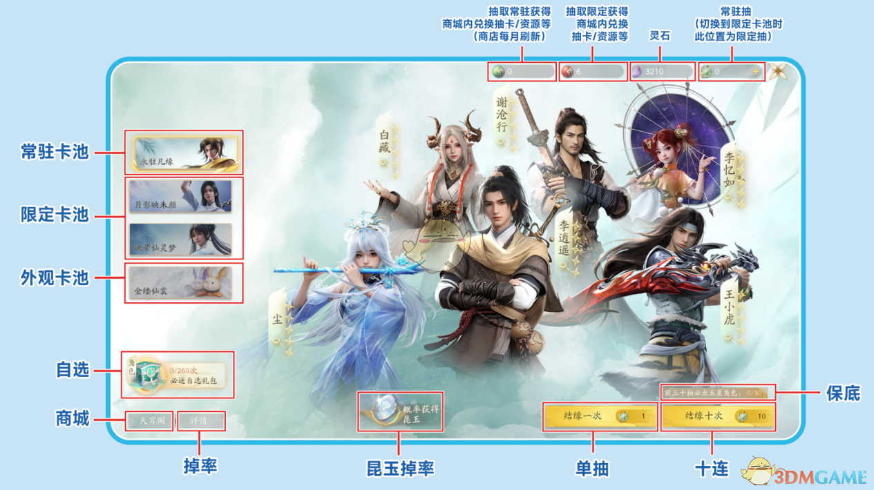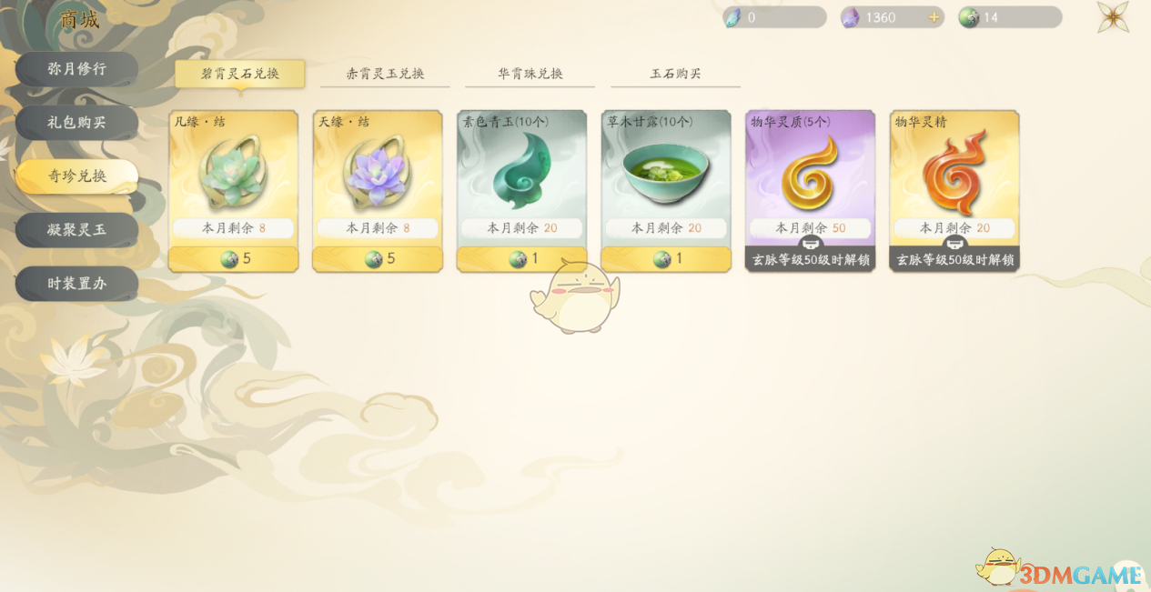 使用抽卡获得的道具进行兑换,【碧霄灵石兑换】物品每月更新一次,【赤霄灵玉兑换】部分物品每周更新。