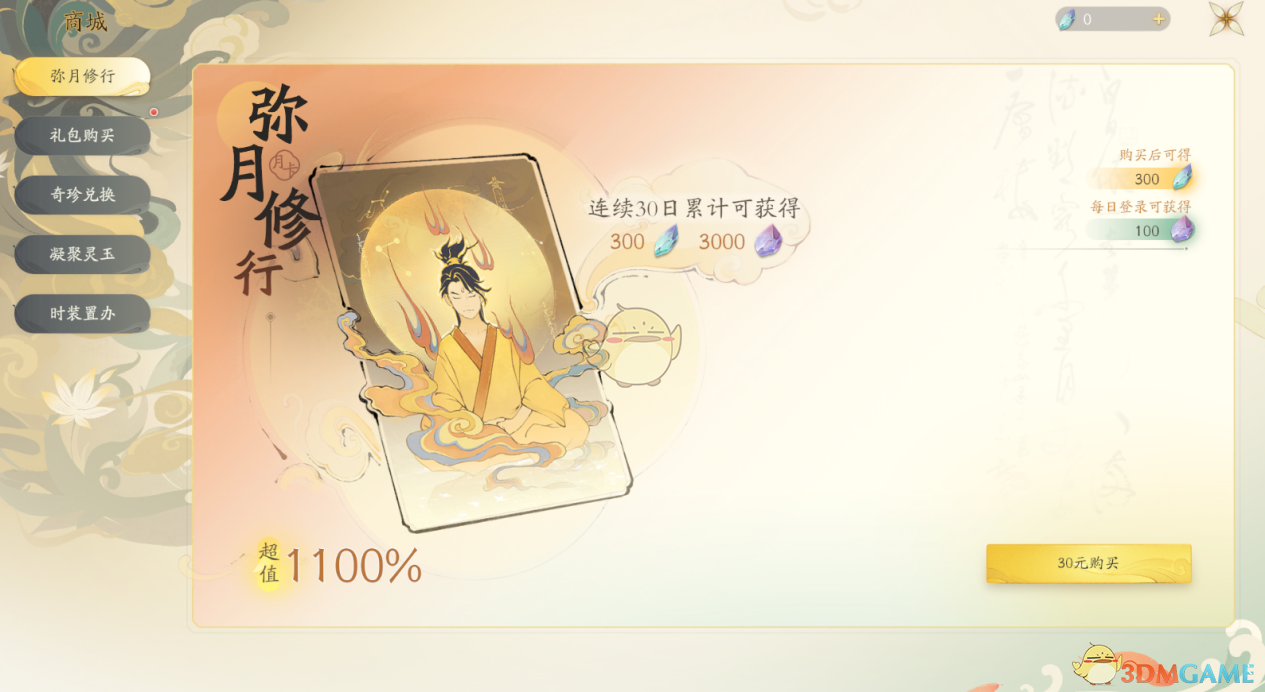 小月卡,连续30日内每日可获得100灵石,最划算的充值方式。
