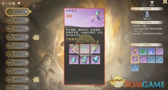 套装来源:副本-历练-多人副本·玄一幻境-第20-100层(其中20-29可掉落蓝/紫品质,30-49可掉落紫/金品质,50-100可掉落金/红品质)。