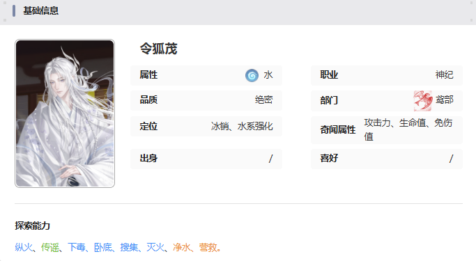 丹曲:战斗开始时,若队伍中有至少3名水属性密探,我方全体的水属性增伤提升20