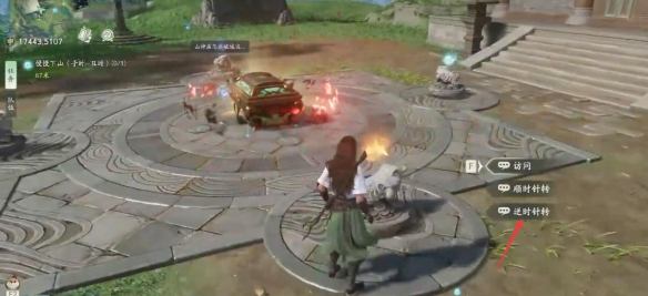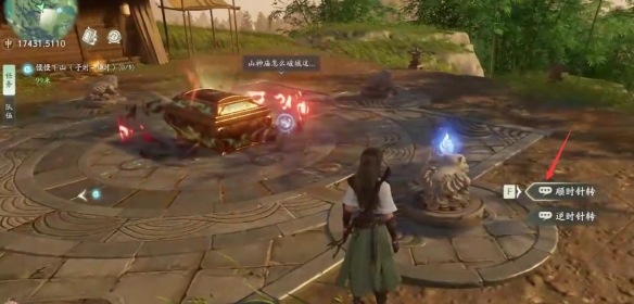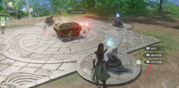 3、把道具放在石台上然后选择【顺时针转】,图示位置拿毛笔;