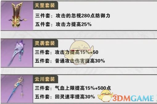 云川套:增加气血上限,提高容错率,适合需要提升生存能力的场景。