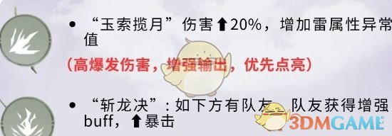 2、玉索揽月命中后,额外恢复9点灵力值,个雷属性伤害18%,持续24S。
