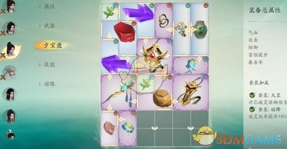 1、搭配相同元素属性,根据装备、材料、饰品共同要求的相同属性可以将他们放在夕宝盘。